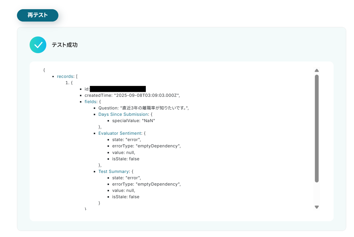 この連携を設定することで、回答内容がリアルタイムでAirtableの指定したテーブルに新しいレコードとして自動で追加されるため、手作業による転記の手間を減らし、入力ミスを防ぐことができます。