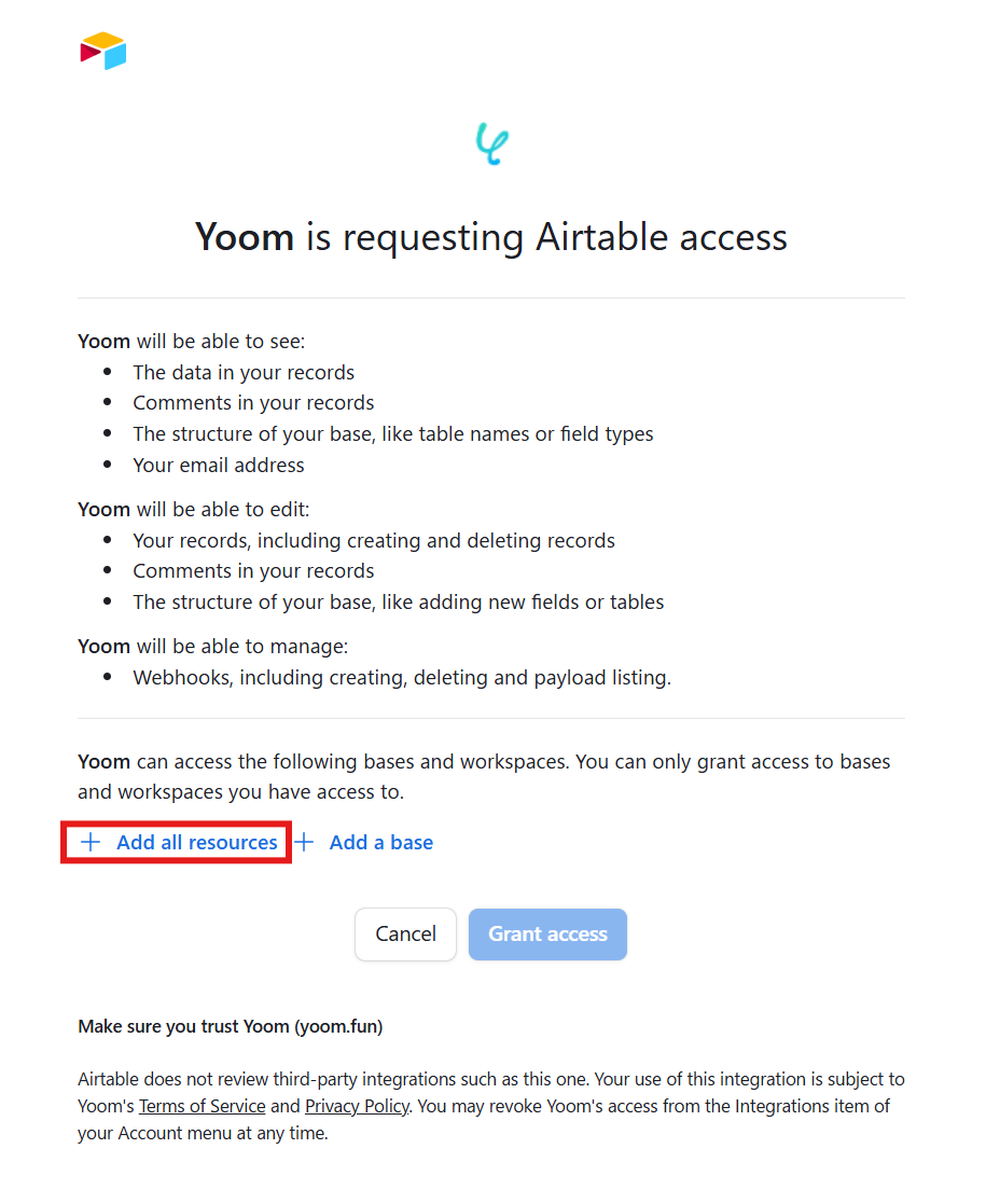 Yoomとの連携を求められるため、「Add all resources」をクリックしてから、「Grant access」ボタンをクリックしましょう。