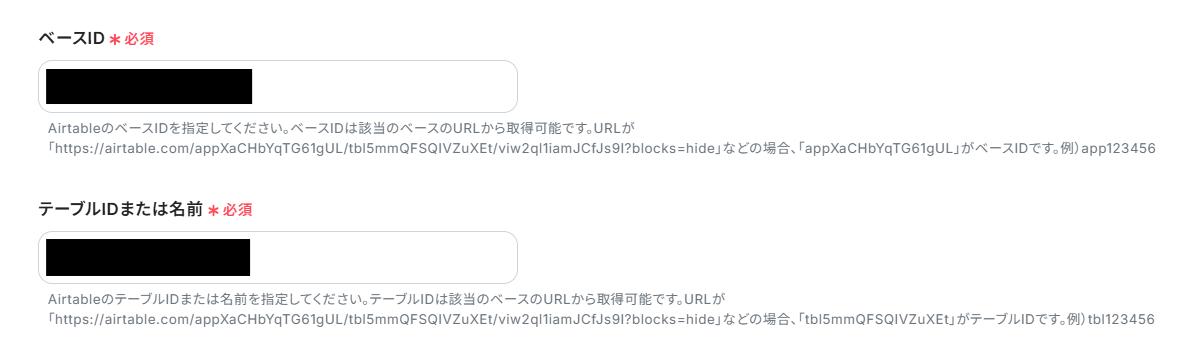 - Airtableのトリガー設定では、連携対象としたいベースID、テーブルIDまたは名前、取得したいフィールド情報を任意で設定してください