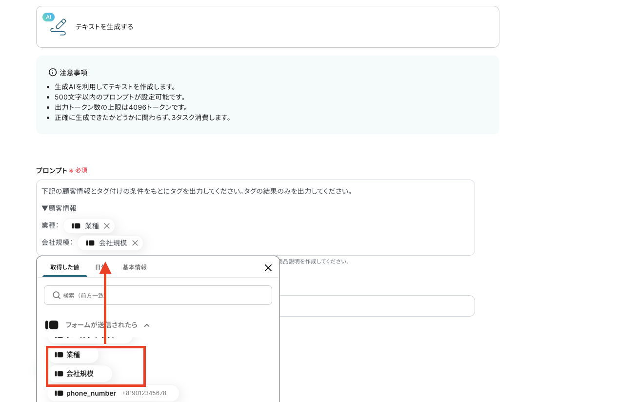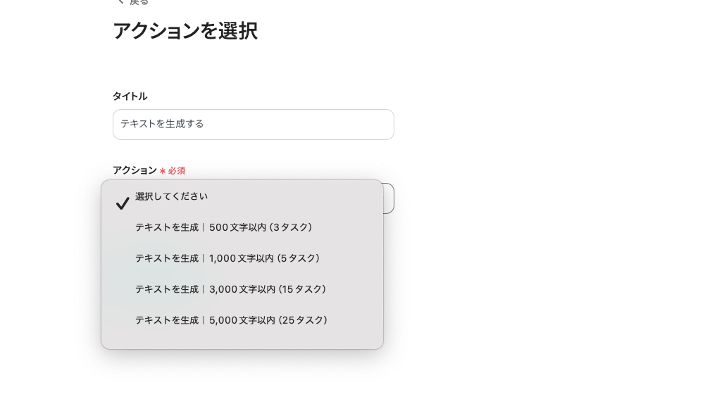 次に、2つ目の「テキストを生成する」をクリックします。生成アクションの設定については、こちらのページにも記載されています。