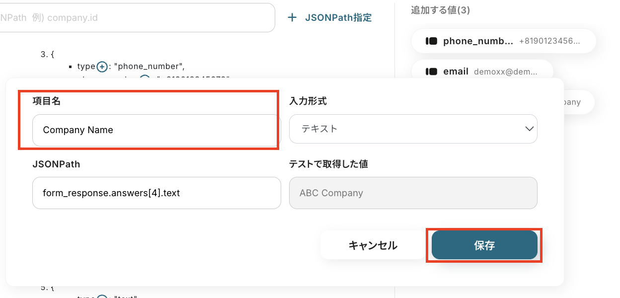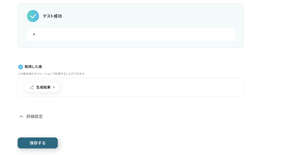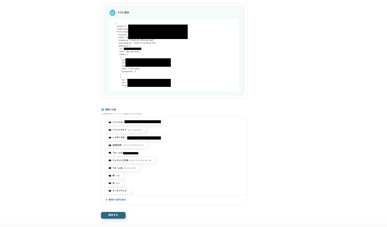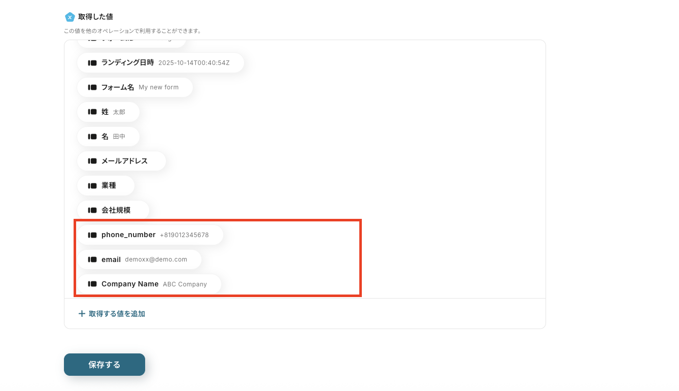 アクション設定画面の『保存する』を押して、取得した値の追加は完了です。