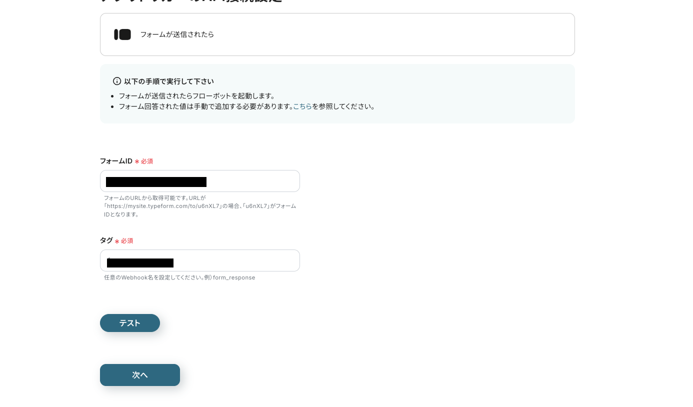 次の画面で、「フォームID」と「タグ」に注釈に沿って情報を入力します。事前に、フローボットに合わせたフォームを作成しておいてくださいね!