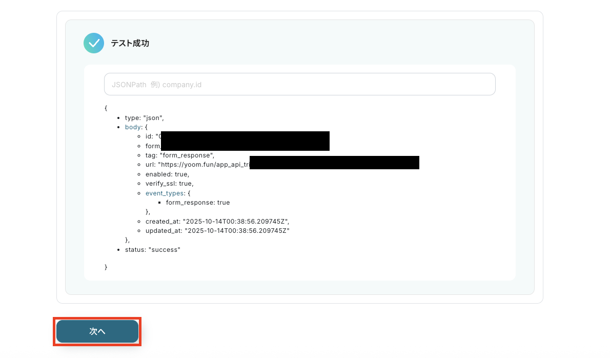 設定後、Yoomの画面に戻り連携テストを行います。これはYoomとTypeformが連携できているのか確認するテストとなります。