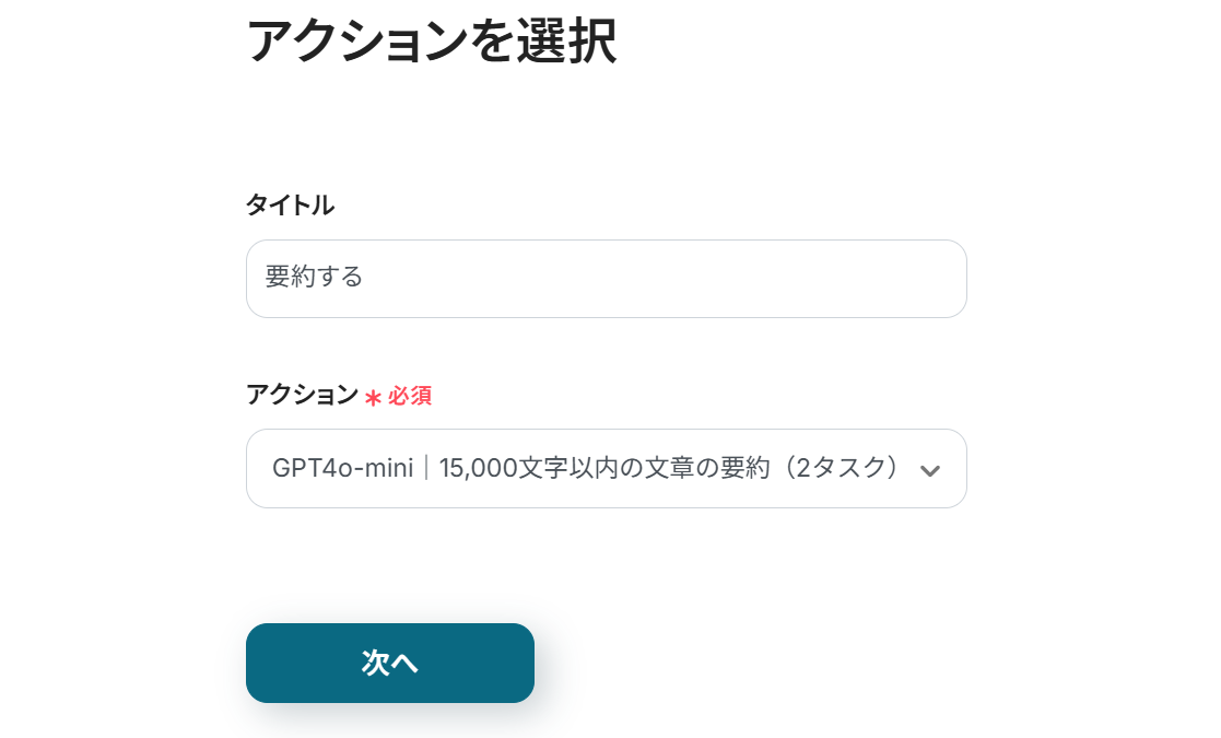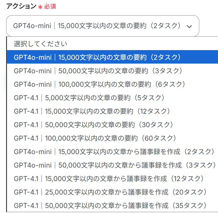 なお、デフォルトのアクションでは2タスクが使われます。プルダウンから、アクションの選択が可能です。