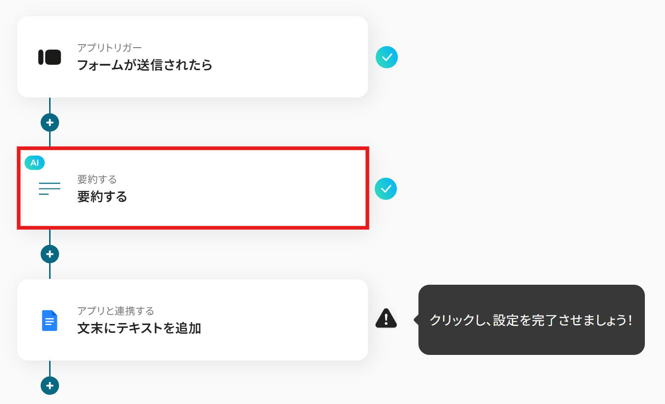 Typeformの回答内容をチェックし、「評価が低い」「改善要望あり」など、あらかじめ設定した特定の条件に合致する回答があった場合のみ、その内容をAIで要約してGoogleドキュメントに追記します。