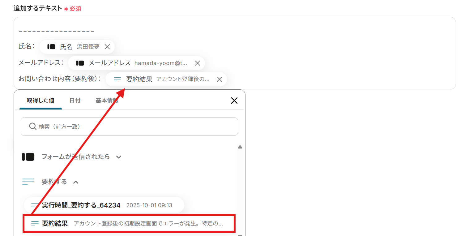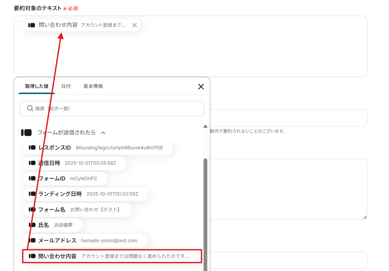 要約対象のテキスト:元から設定されています。編集欄をクリックすると以下のようにTypeformから取得した値をそのまま引用できます。