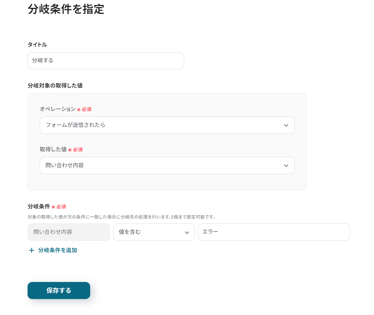 たとえば、以下のように設定すると問い合わせ内容に「エラー」という文字が含まれている場合のみGoogleドキュメントにテキストを追加されるようになります。