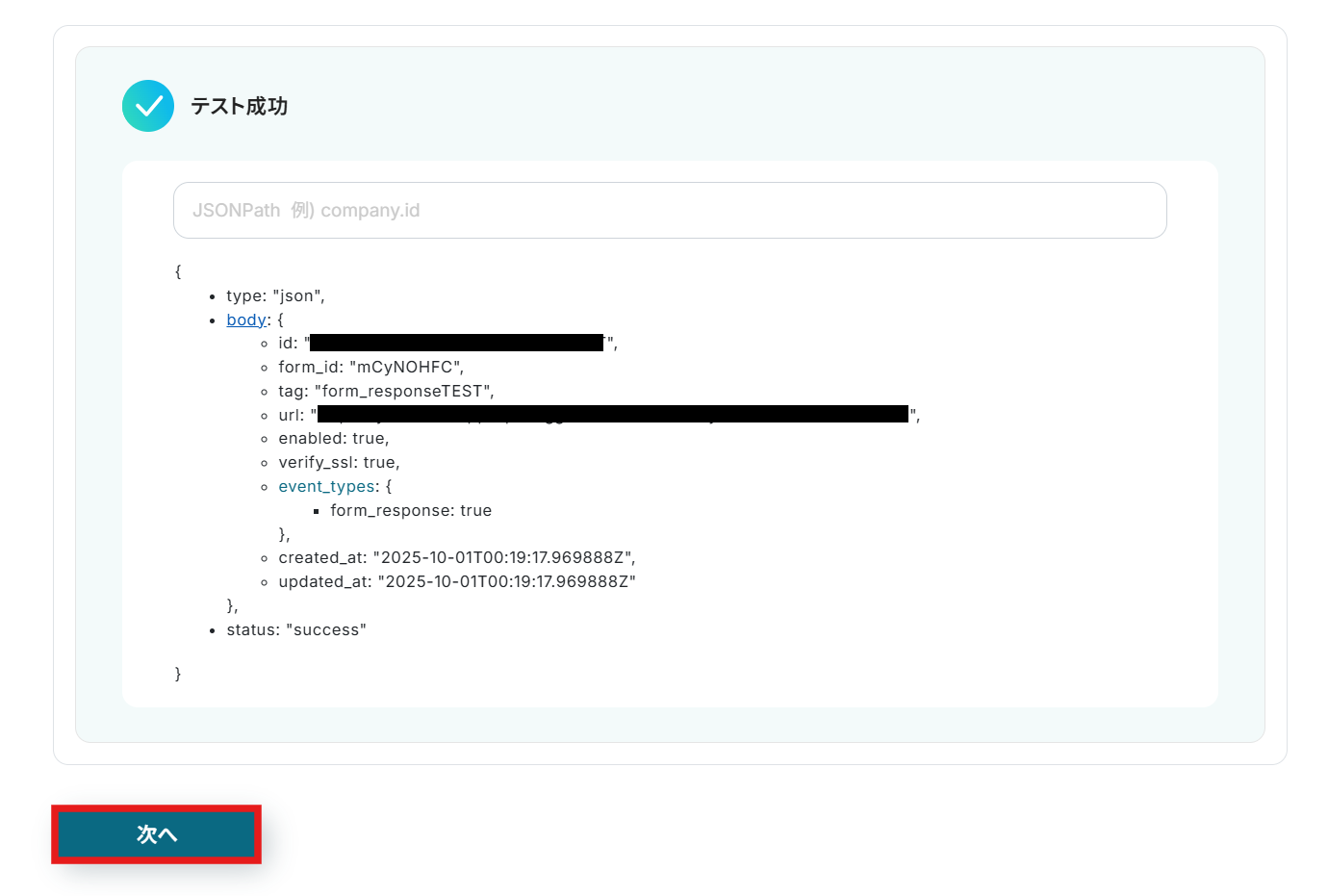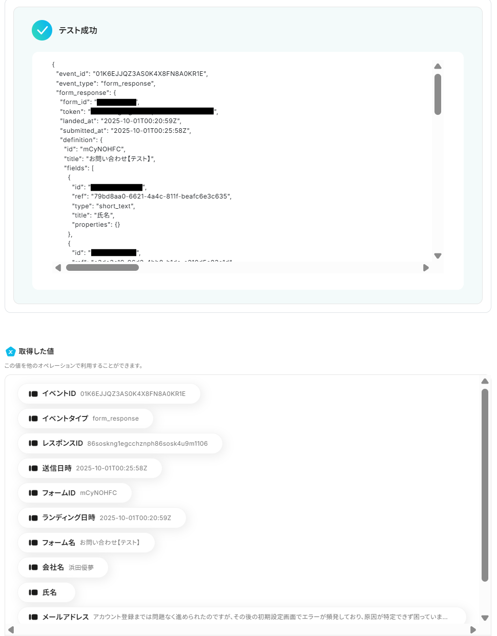 テストが成功すると「テスト成功」という画面が表示され、Typeformから取得した情報が確認できます。