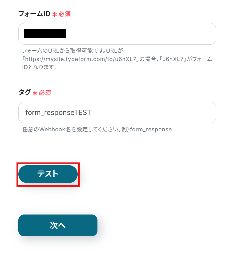 設定が終わったら、YoomとTypeformが連携できているかテストを行います。テストボタンをクリックしましょう。