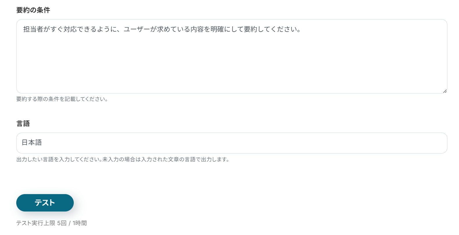 要約の条件・言語:どのように要約を行うのか詳細な設定が可能です。今回は以下のように設定しました。