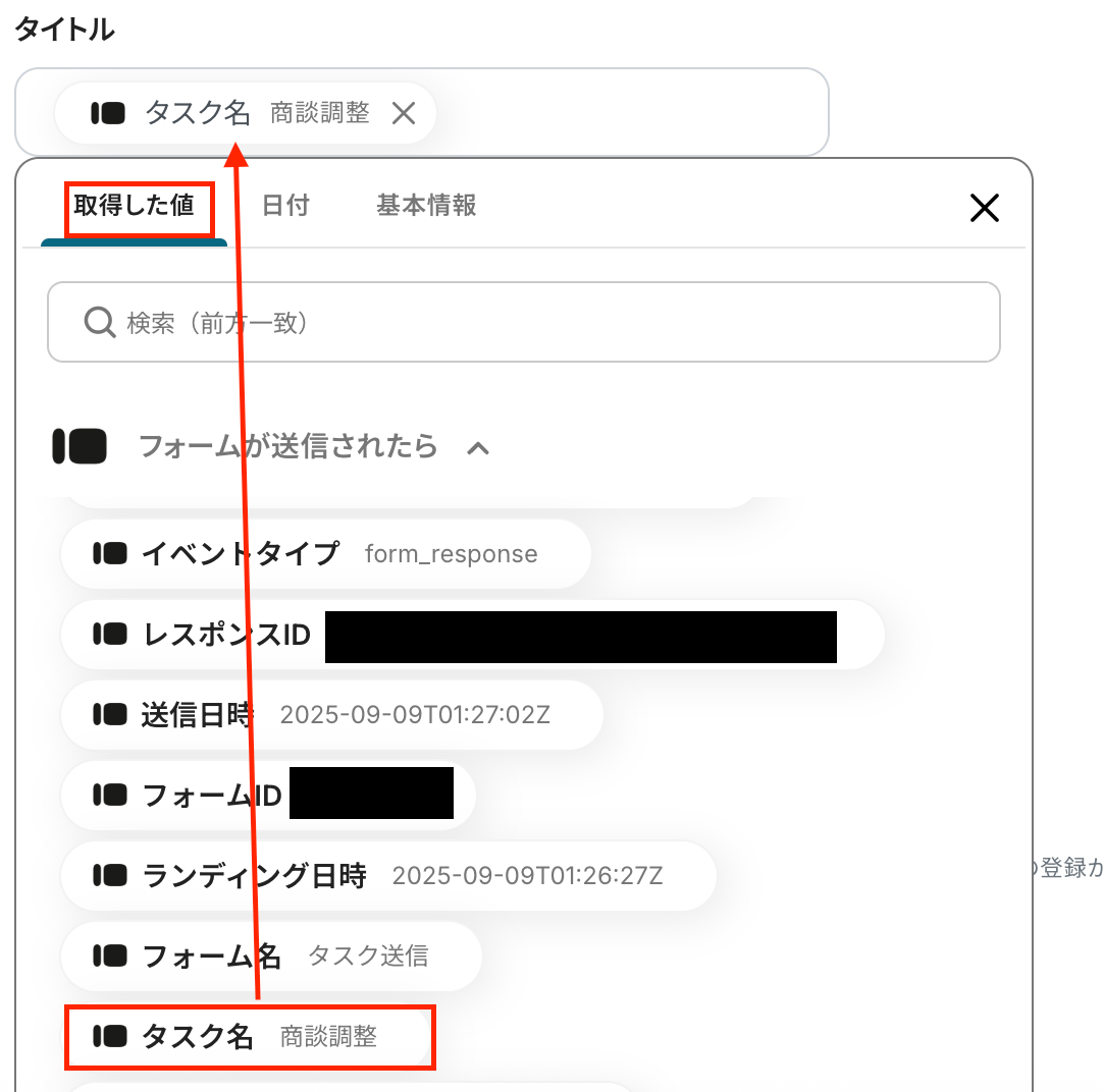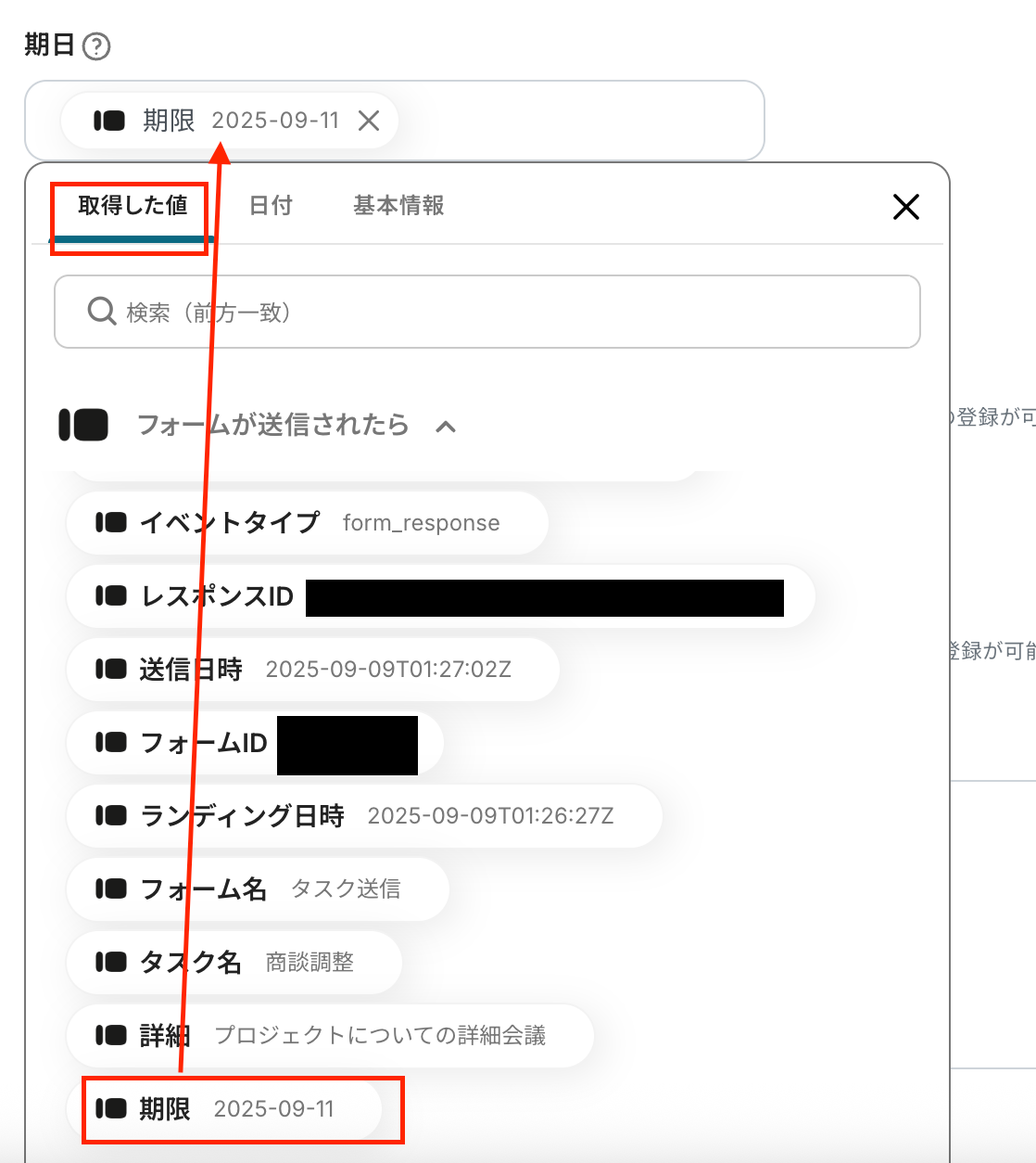 なお、今回はTypeformに「タスク名」「詳細」「期限」を回答したという例でこの後の設定を進めていきます。