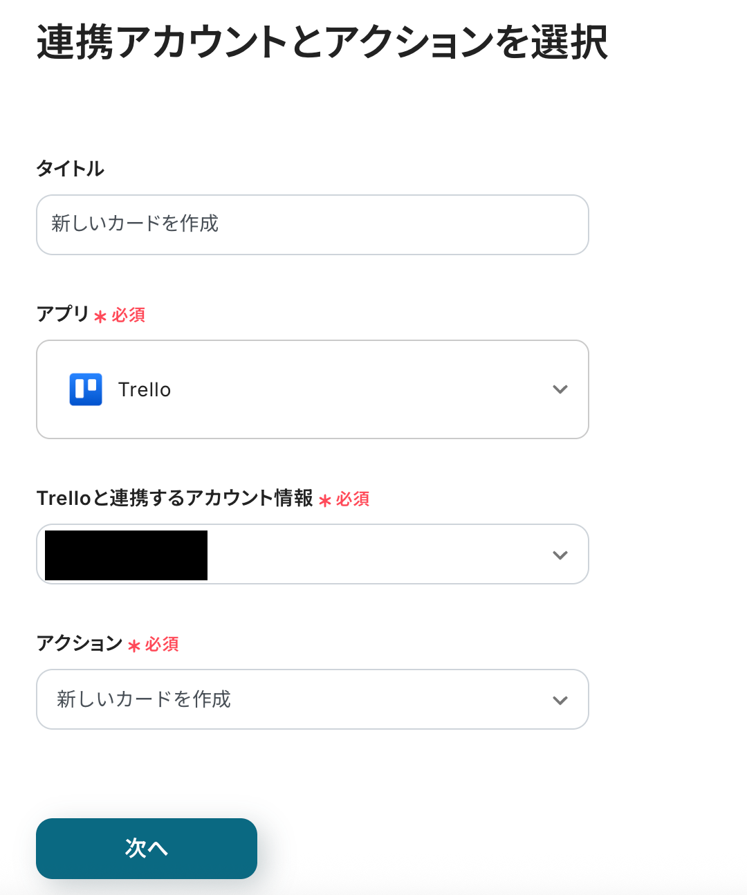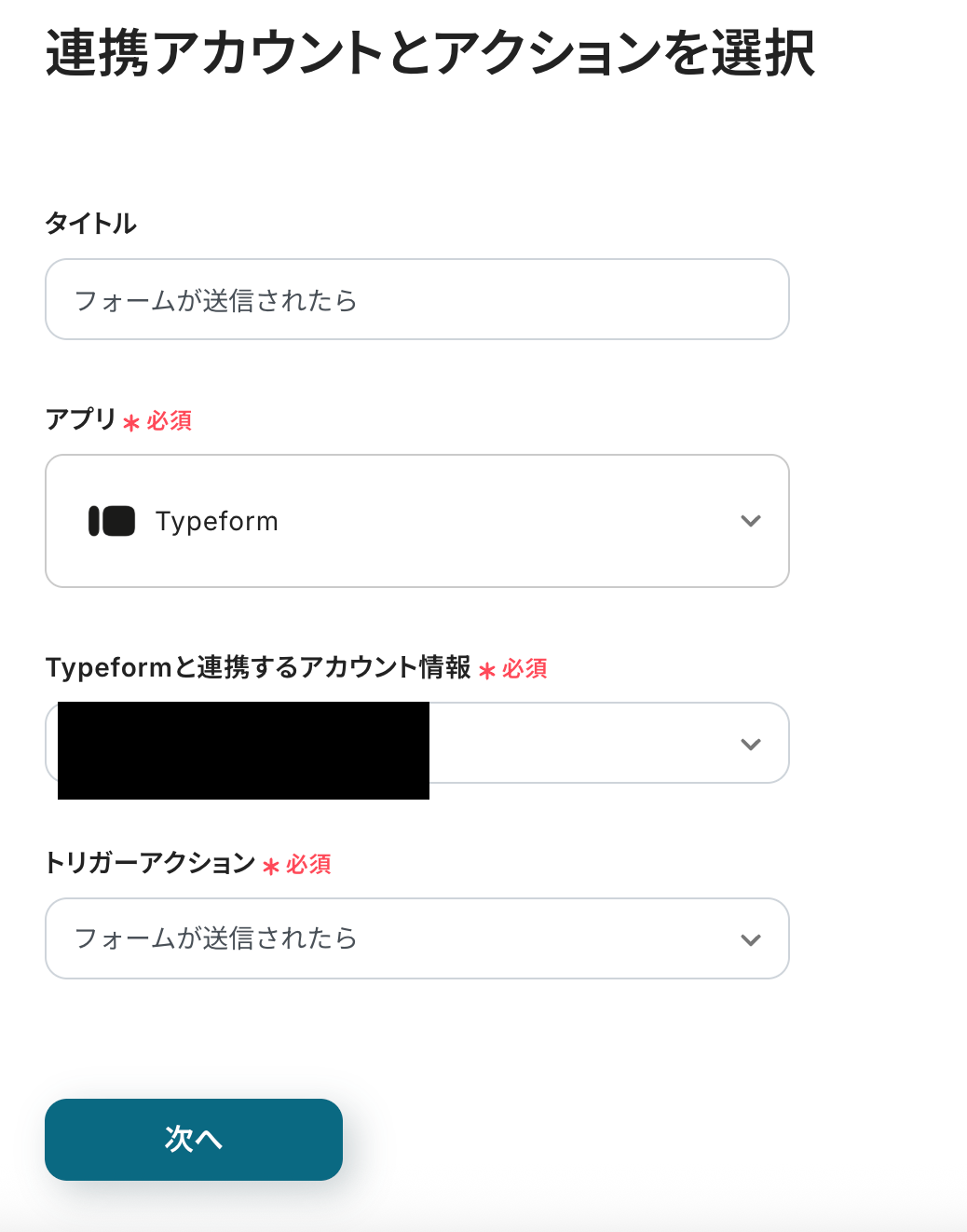 連携アカウントとアクションを選択の画面は、以下を確認し「次へ」をクリックしてください。