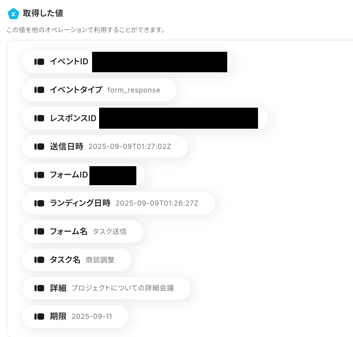 テストが成功するとTypeformの情報の一部が取得した値として画面下部に表示されます。