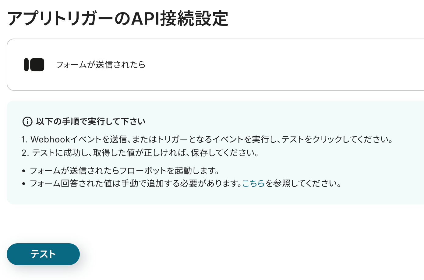 フォームに回答したら、Yoomに戻りテストを行います。テストボタンをクリックしましょう。