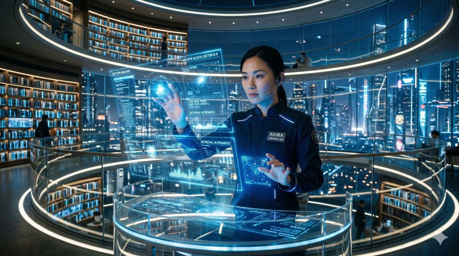 - 被写体:未来的な円形図書館で、透過型のホログラムディスプレイを操作する女性司書