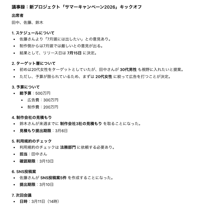 会議の雑多なメモから、決定事項とネクストアクションを明確にした議事録を作成します。
