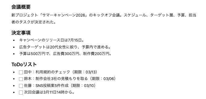 ToDoリストがチェックボックス形式で出力されている点も、そのままタスク管理に流用できるため実用的です。