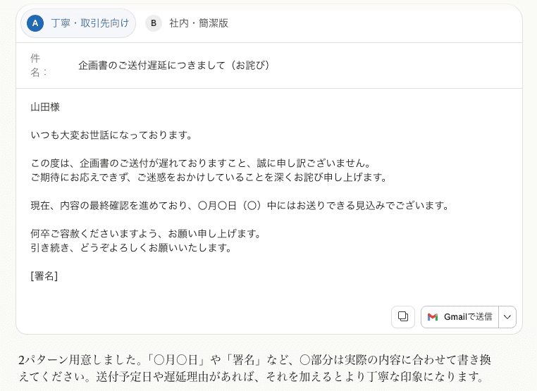 一方、テンプレありの場合は、役割設定と詳細な定義により、そのまま送信できるレベルの文面が生成されました。