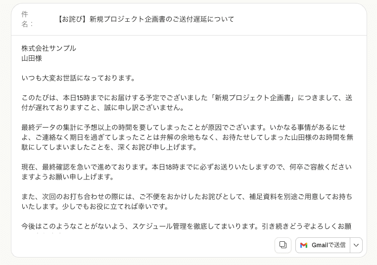 次に、前述の「メール作成テンプレート」を、謝罪メールに応用した検証です。