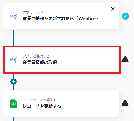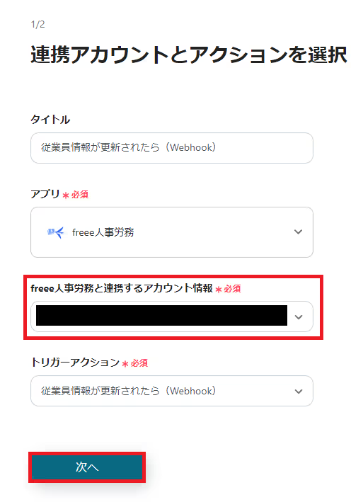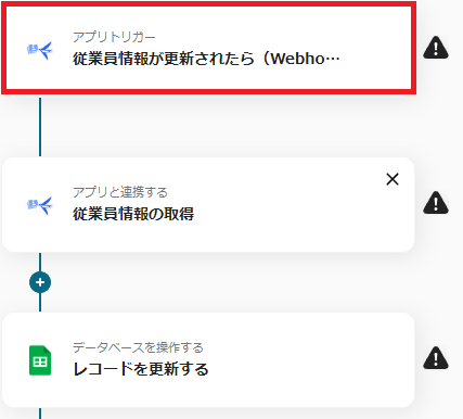 最初に「従業員情報が更新されたら(Webhook)」を選択してください。