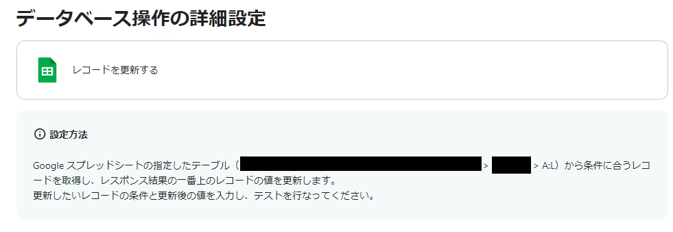 ※更新後のレコードの値には、上記で指定したGoogle スプレッドシートのヘッダー(1行目)の値が表示されます。