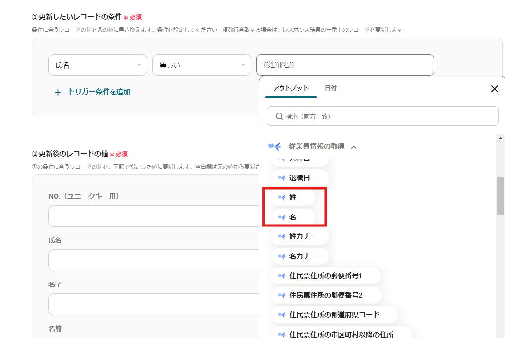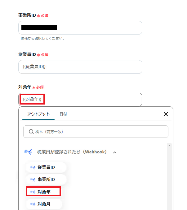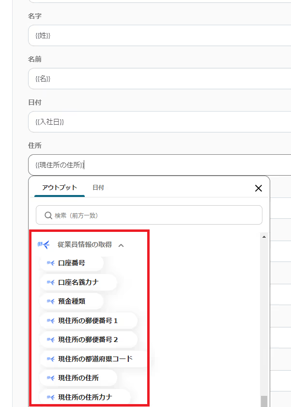 入力欄をクリックすると、freee人事労務の取得した値が使用できるので該当のデータを設定しましょう。