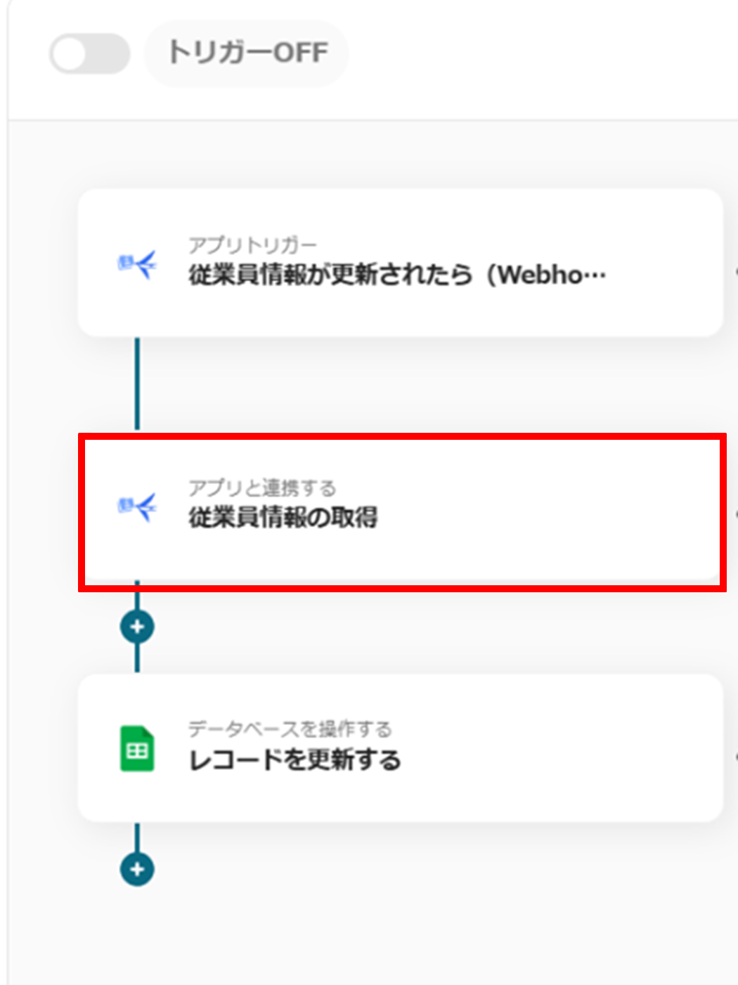 アプリトリガーの「従業員情報が更新されたら(Webhook)」をクリックします。