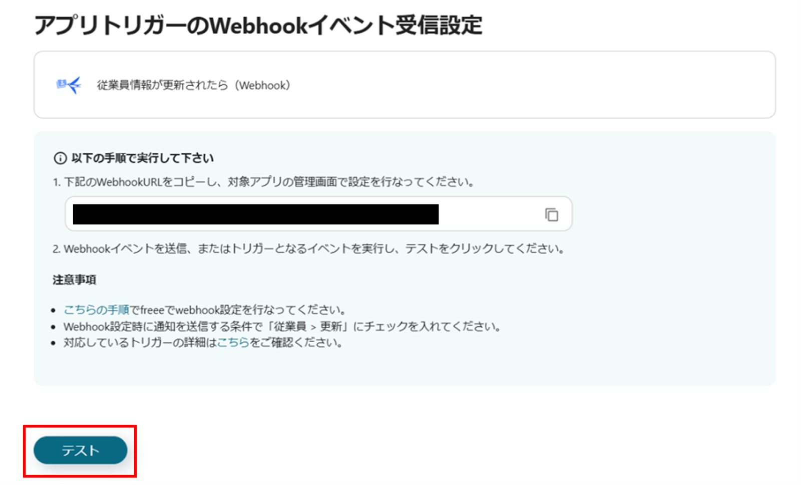 (3))「アプリトリガーのWebhookイベント受信設定」画面から、WebhookURLをコピーし、freee人事労務の管理画面で設定を行います。