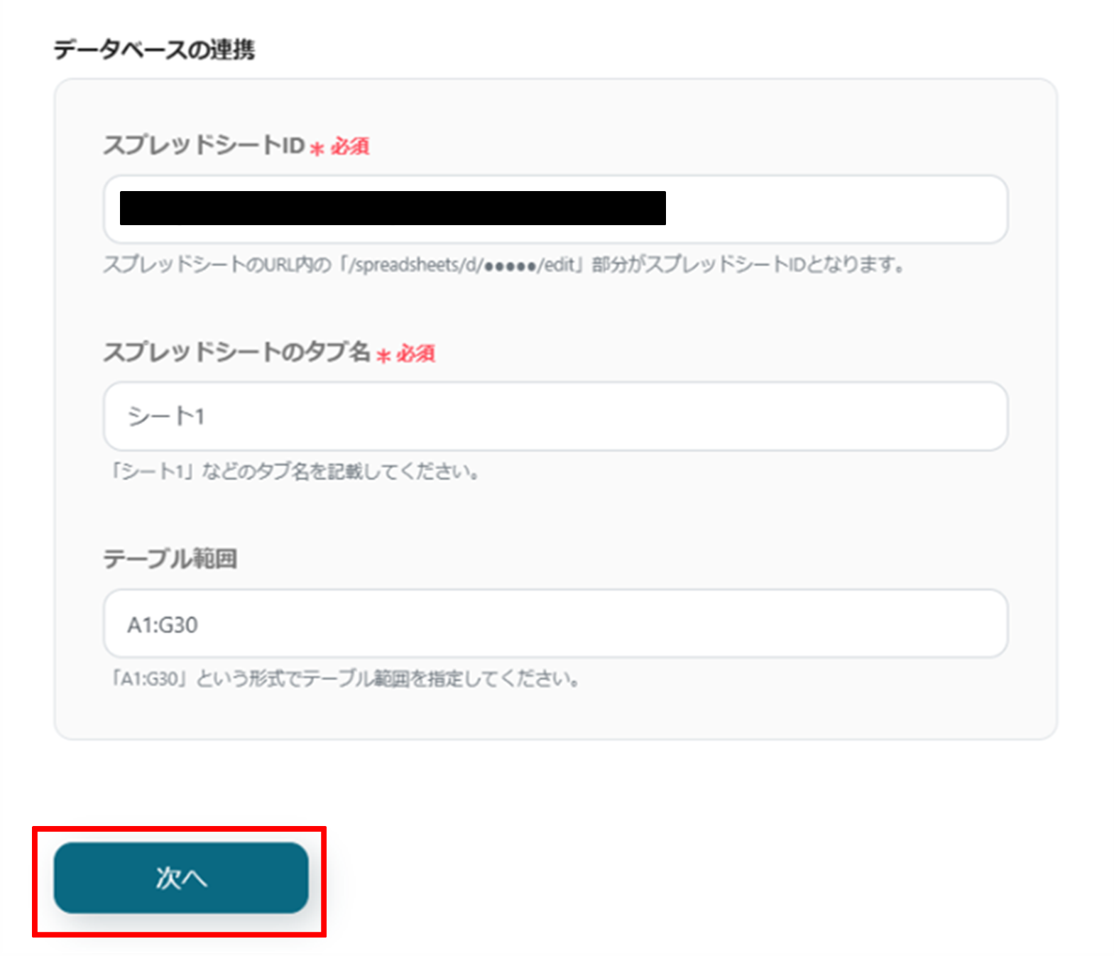 下へ進み、スプレッドシートID、スプレッドシートのタブ名、テーブル範囲を入力します。