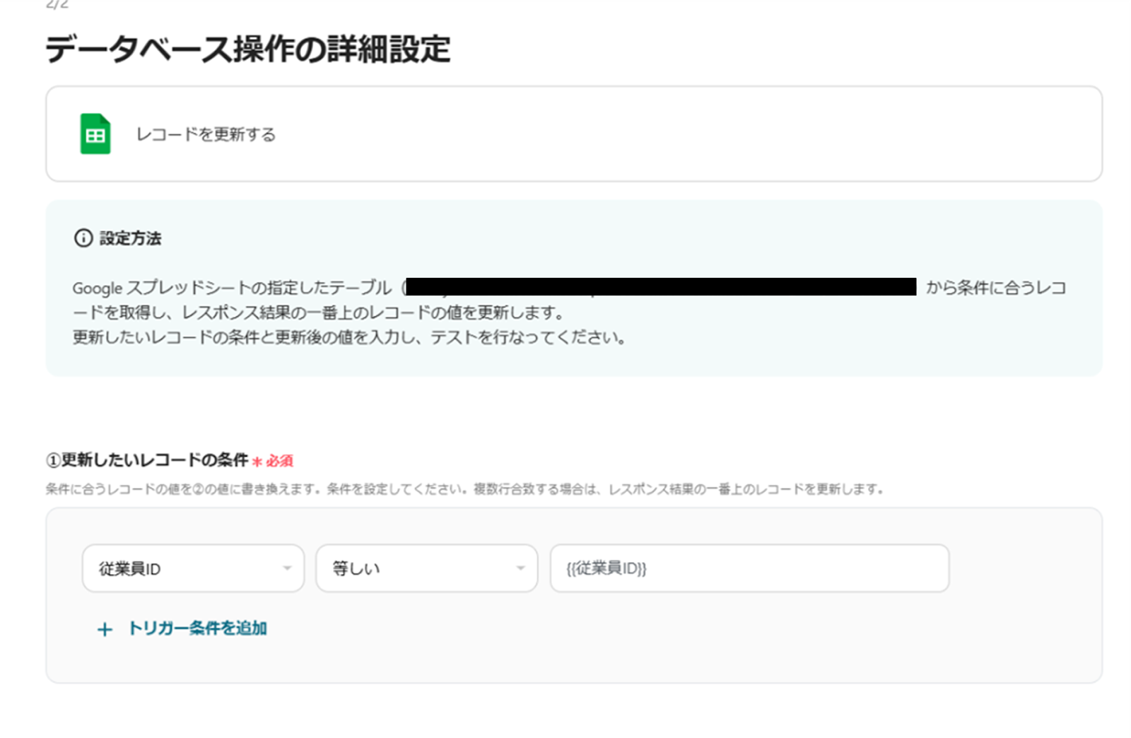(3)「データベース操作の詳細設定」画面から、①更新したいレコード条件を入力します。