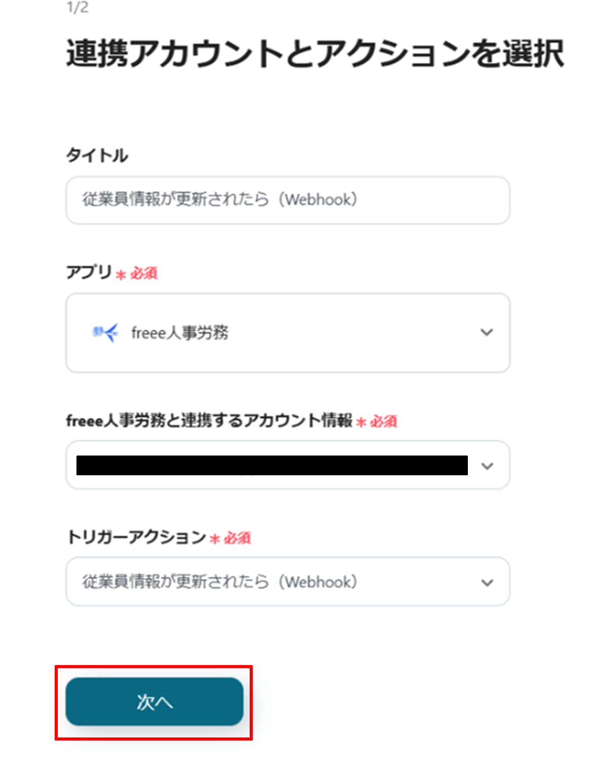 (2)freee人事労務の「連携アカウントとアクションを選択」画面から、freee人事労務と連携するアカウント情報を確認し、トリガーアクションは「従業員情報が更新されたら(Webhook)」のままで「次へ」をクリックします。