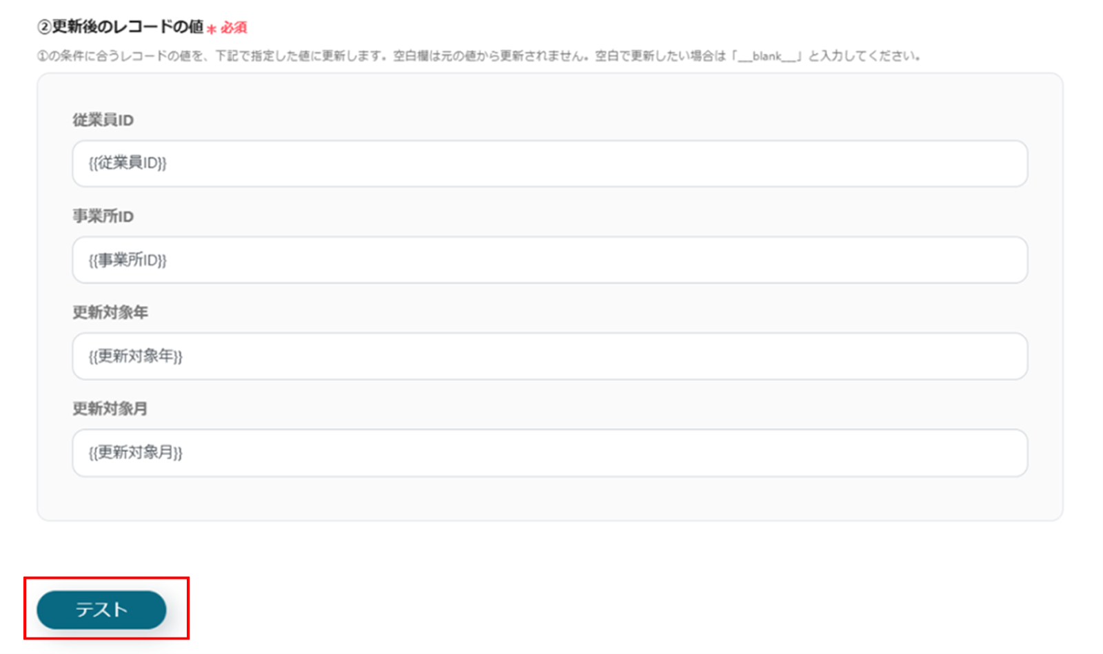 下へ進み、②更新後のレコードの値をアウトプットから選択します。