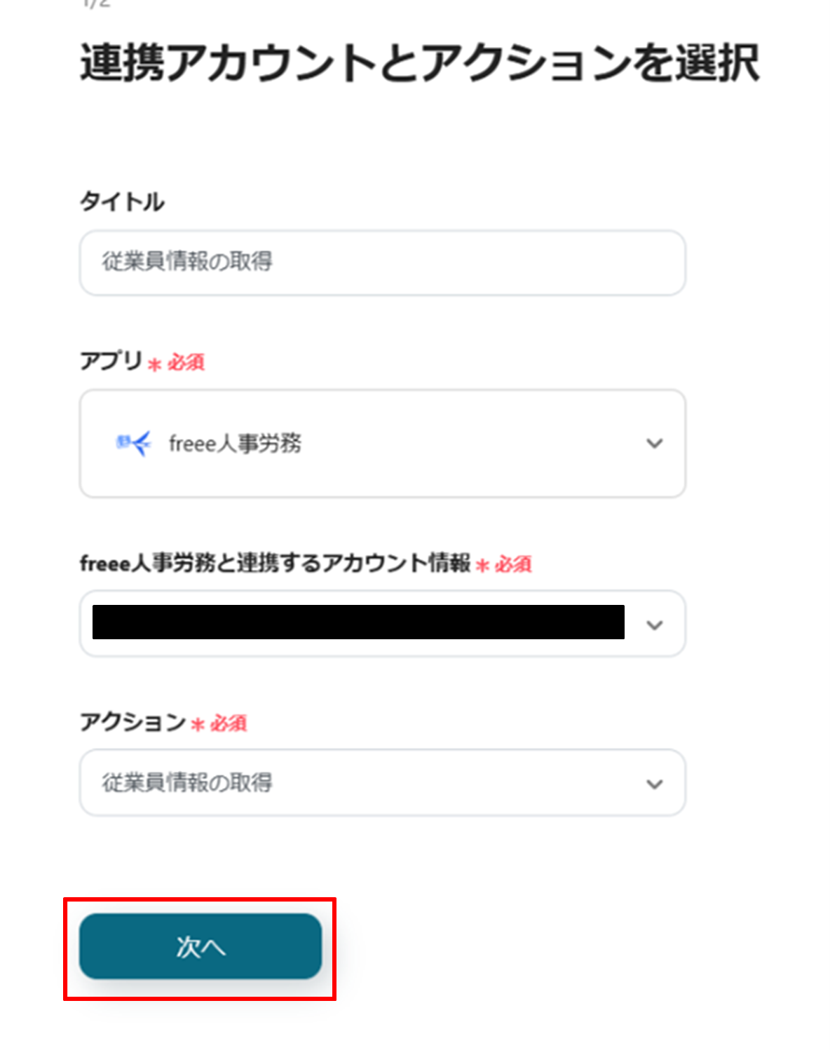 (2)freee人事労務の「連携アカウントとアクションを選択」画面から、freee人事労務と連携するアカウント情報を確認し、アクションは「従業員情報の取得」のままで「次へ」をクリックします。
