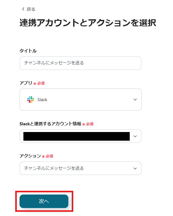 3.Slackの「Slackに通知」というオペレーションで、連携アカウントや送信先のチャンネル、メッセージ内容の設定を行ってください。