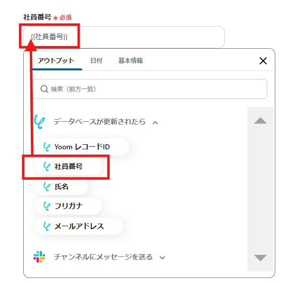 たとえば、「社員番号」は、入力欄をクリックして「取得した値」から該当データを選択することで入力できます。