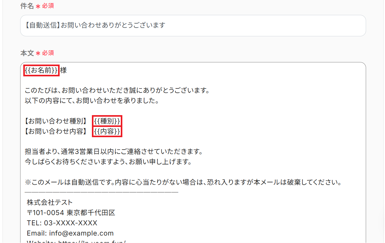 最後に件名と本文を入力してください。こちらもアウトプットを利用して入力すると簡単にフォームの内容を反映させることができます。