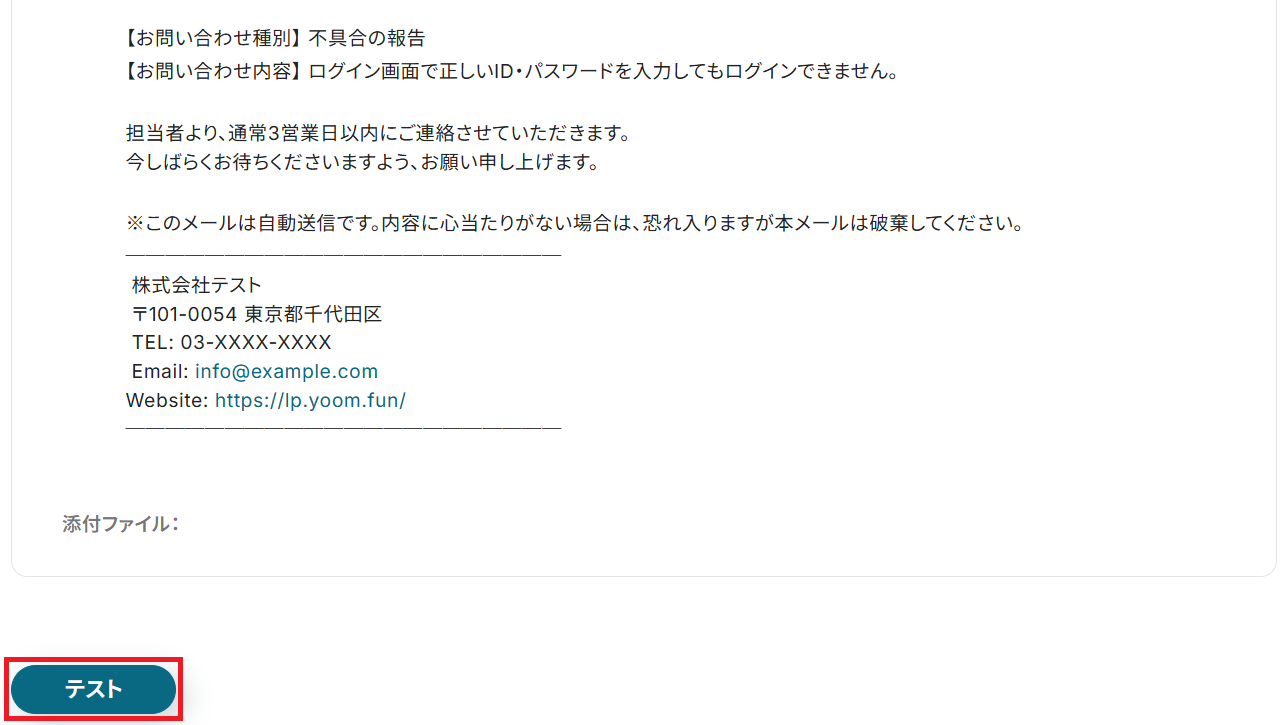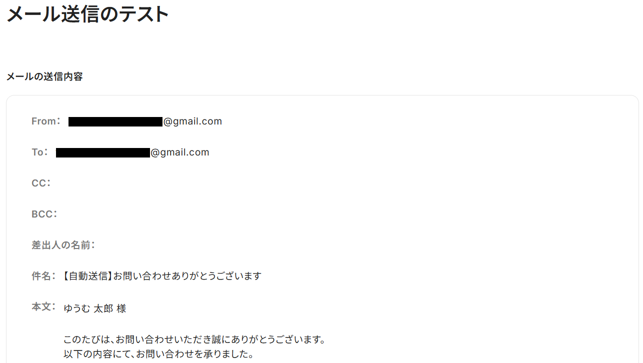 「次へ」をクリックするとメール送信のテスト画面になるので、内容に誤りがないか確認してテストしましょう。