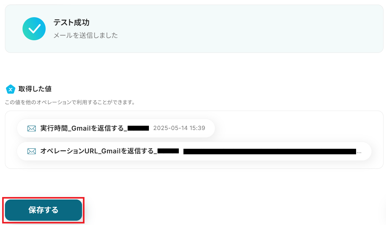 成功したら保存してください。今回は「+ 取得する値を追加」から下記の赤枠のアウトプットを追加しました。