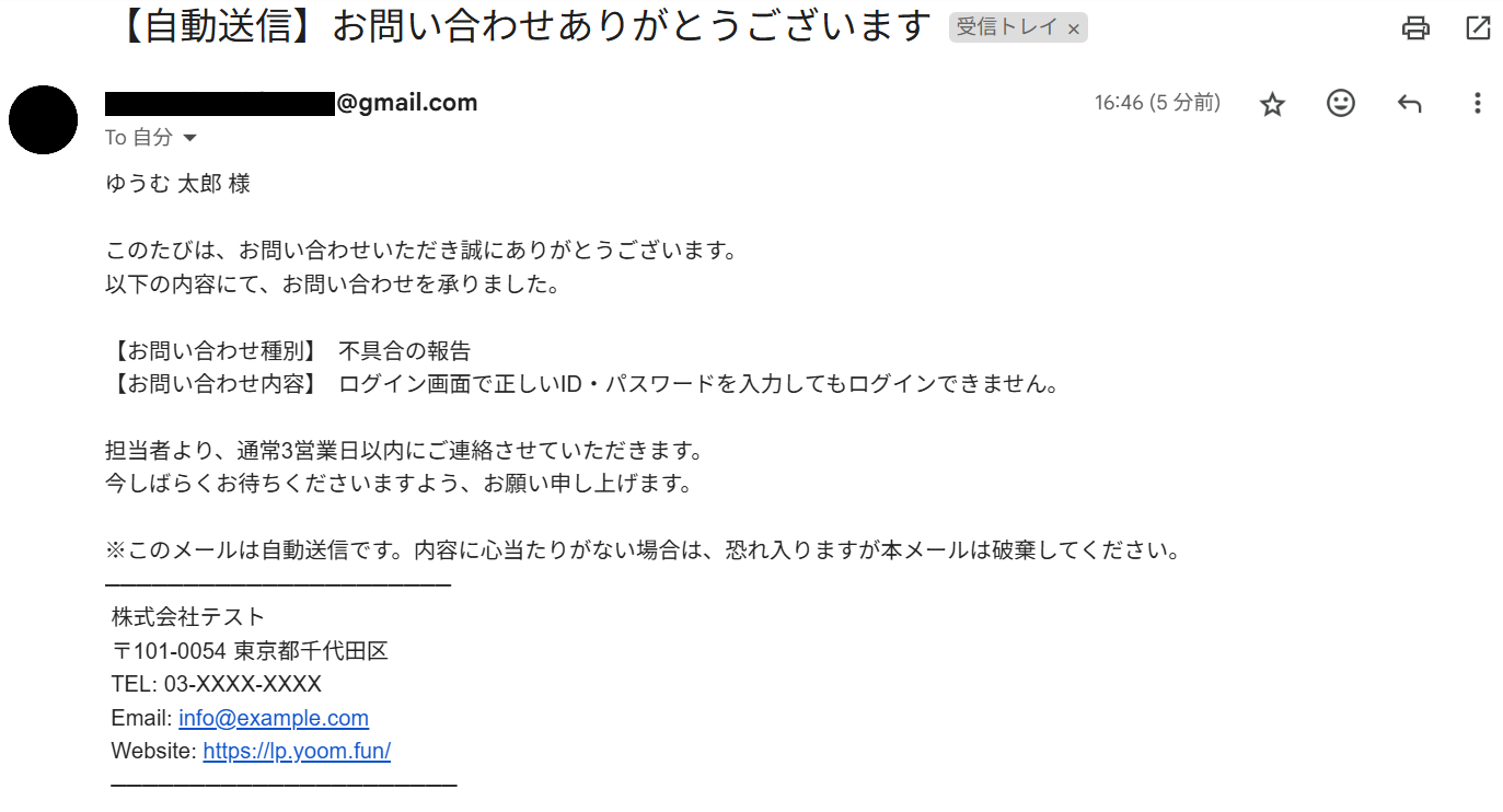 Googleフォームで入力したメールアドレスに自動送信メールが届きました!