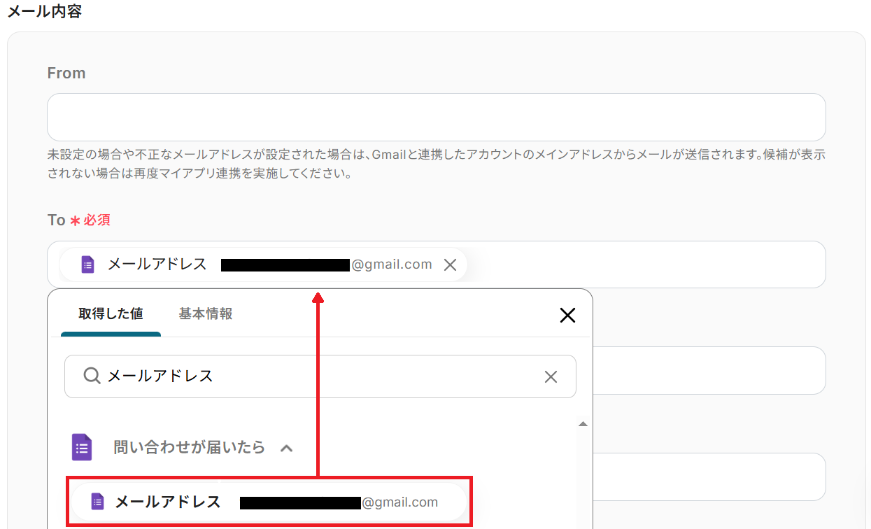 次に、Toの欄にステップ3で取得したアウトプットの「メールアドレス」を選択しましょう。
