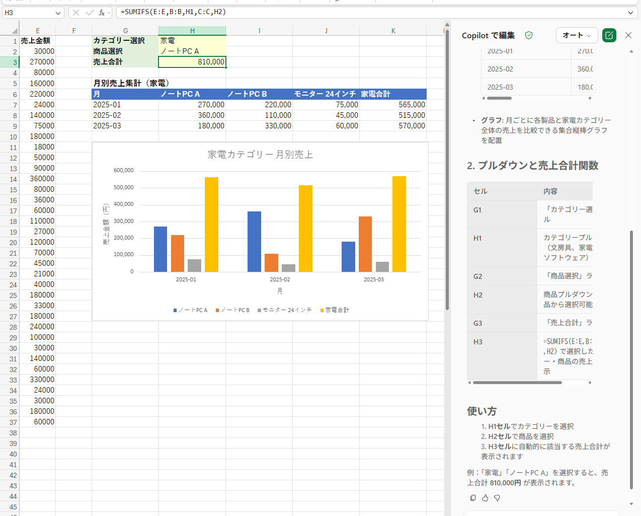 このシートの売上データから、家電カテゴリーの各製品の月別売上を棒グラフにしてシート内に追加してください。 グラフの横軸には、製品ごとの売上だけでなく、カテゴリー全体の売上も入れてください。 また、G1セルにカテゴリーのプルダウン、G2セルに商品のプルダウンを作成し、カテゴリーと商品を選択すると、G3セルに売上合計が表示される関数も作成してください。