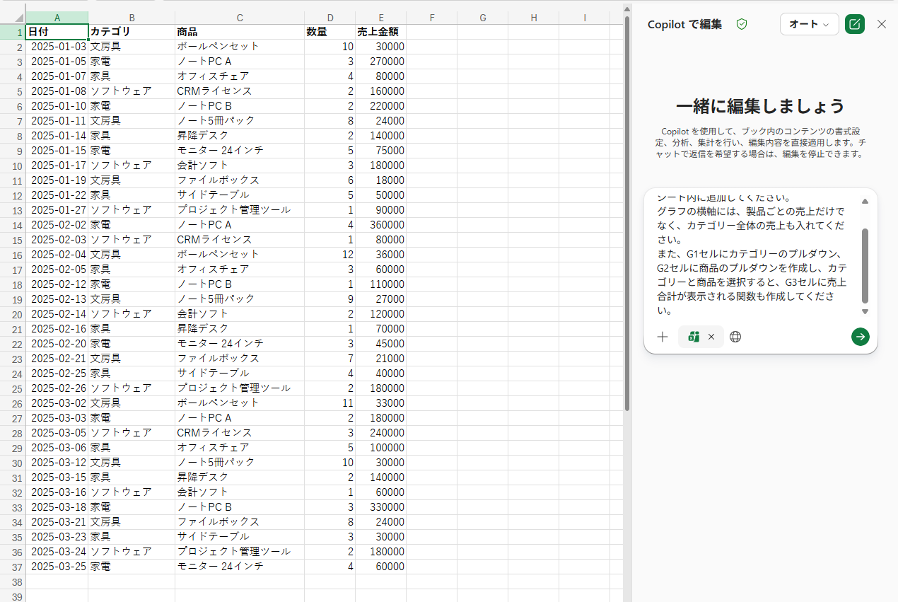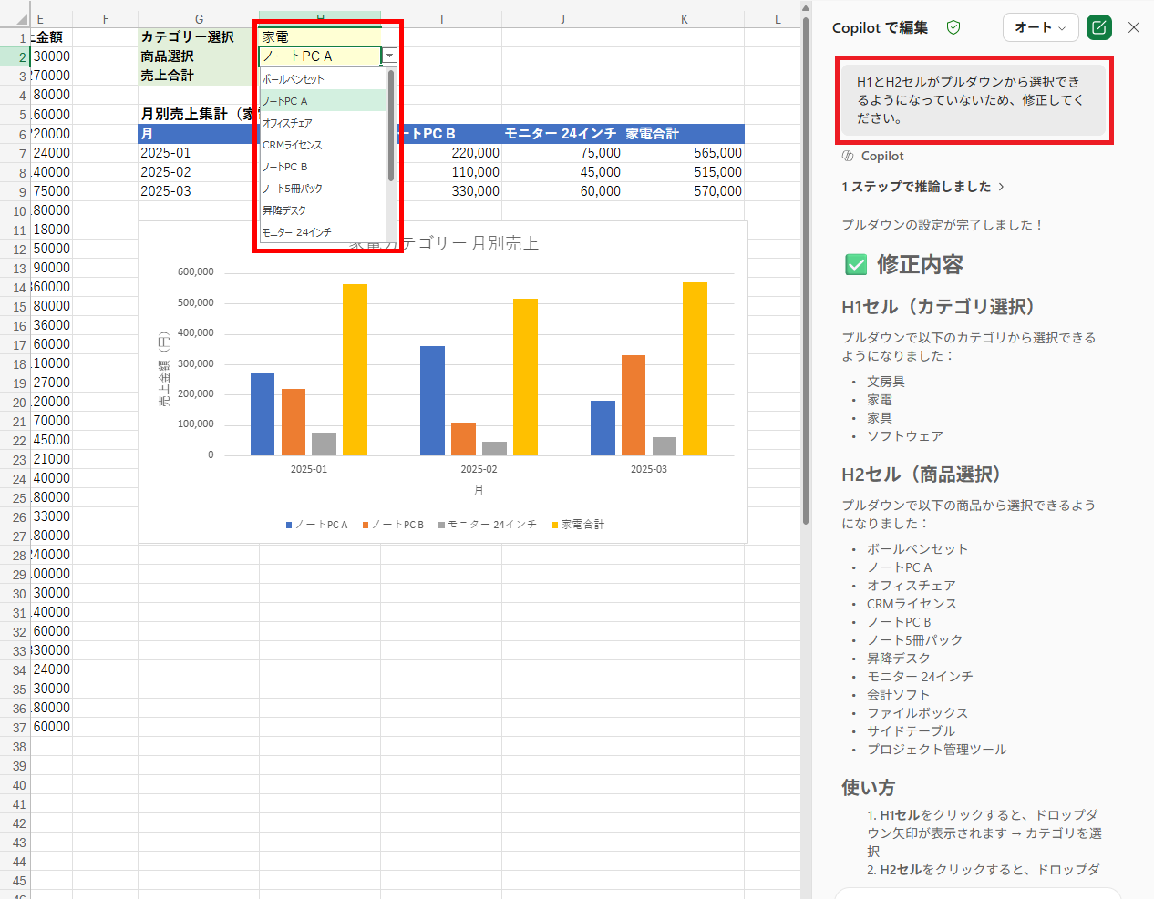 自然言語で「どのように作成してほしいか」を説明するだけで、意図した通りのグラフや関数を作成できることが明確になりました。 売上データから特定のカテゴリーのみを抽出してグラフ化するような作業においても、事前のデータ形式の変換が不要であり、スムーズに進行します。 今回の検証では、カテゴリーや商品をプルダウンにする指示が一度で反映されないという場面もありましたが、追加で修正を依頼したところ、意図した形式へ変換してくれました。 Copilotの出力内容の確認は必ず必要になりますが、対話を通じて迅速に軌道修正できるため、安心して作業を任せられます。 このように、これまでExcelの知識が必要だった複雑な処理も手軽に行えるようになり、誰でも対応できる業務の幅が大きく広がります。