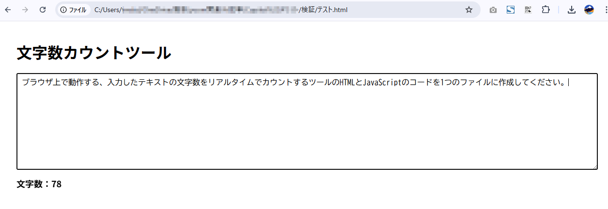 ブラウザ上で動作する、入力したテキストの文字数をリアルタイムでカウントするツールのHTMLとJavaScriptのコードを1つのファイルに作成してください。
