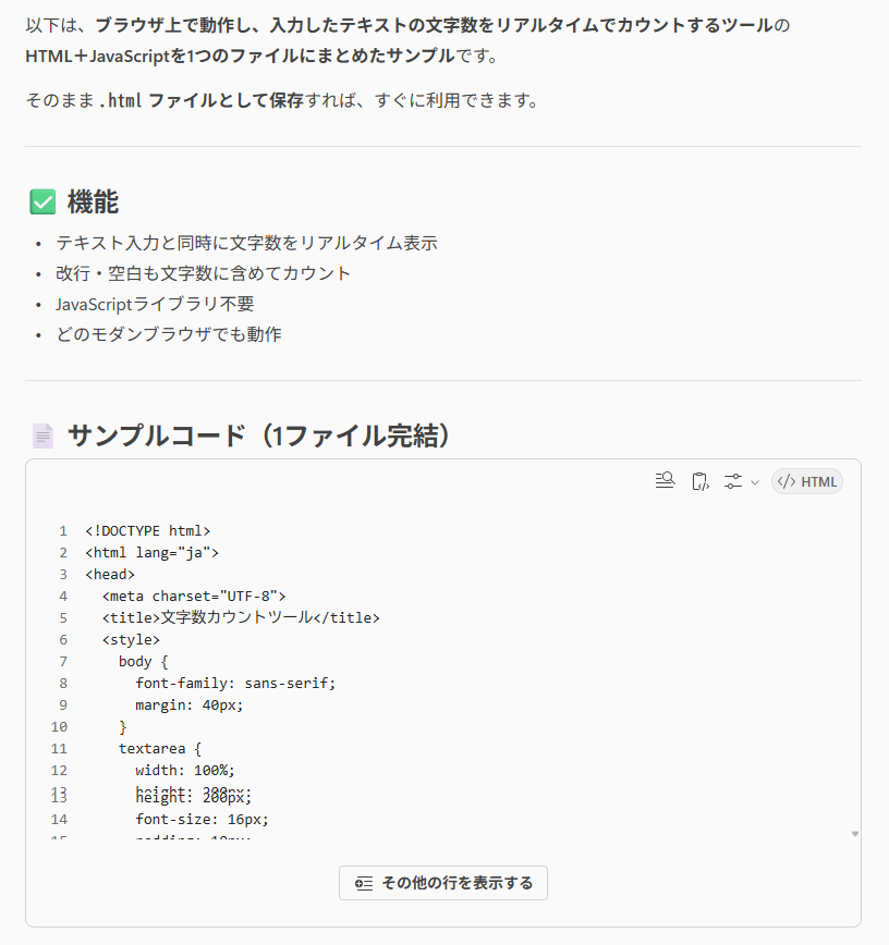 作成したいアプリの条件を簡単な言葉で説明するだけで、実用的なWebアプリを作成できることがわかりました。 今回は文字数をカウントするツールを指示しましたが、こちら側でコードを一切記述することなく、意図した通りのプログラムが完成しています。 これはCopilotが持つコード生成の精度の高さを物語っています。 Copilotは、日常的なドキュメント作成やデータ集計といった一般的な業務の効率化にとどまりません。 自分自身の業務に合わせた専用のタスク管理アプリなど、日々の細かな課題を解決するツールを作る用途にも大いに活用できます。 専門的なITスキルを持たない方であっても、アイデア次第で業務を効率化するための簡単なアプリを自ら生み出せるようになるのは、非常に大きなメリットと言えます。