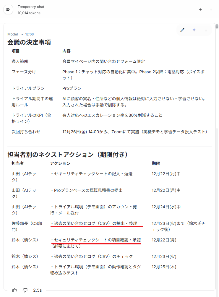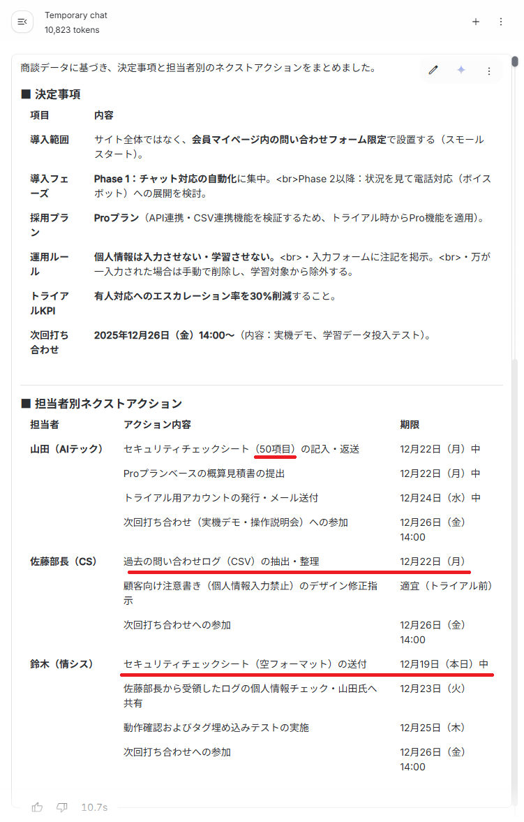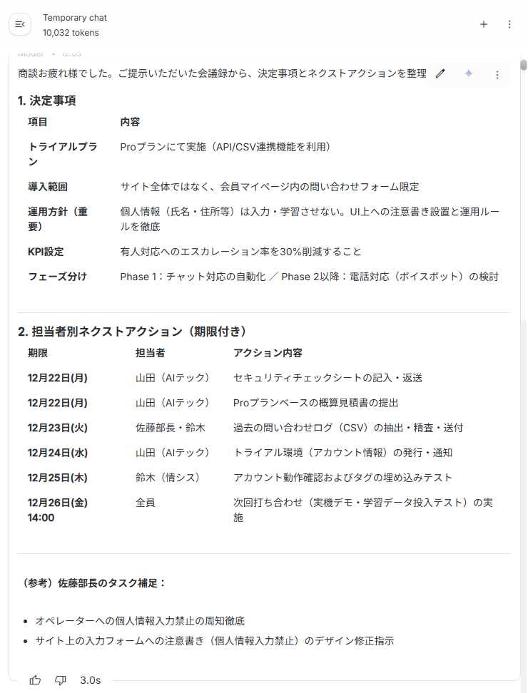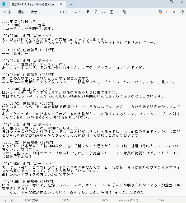 検証②:会議ログから議事録作成(情報抽出) 次に、長文会議の文字起こしデータから、決定事項とネクストアクションを構造化して抽出してもらいます。 検証では、以下の約15,000時の文字起こしデータを利用しました。