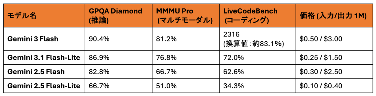 ここでは、「Gemini 3.1 Flash-Lite」と上位モデル「Gemini 3 Flash」、そして前世代の「Gemini 2.5 Flash」「Gemini 2.5 Flash-Lite」の4モデルを比較します。
