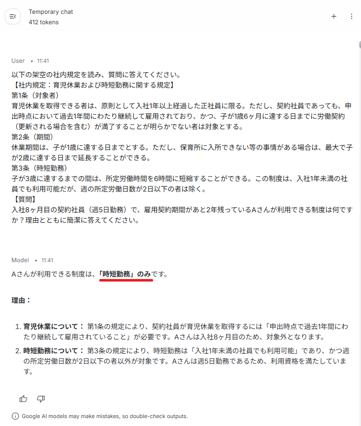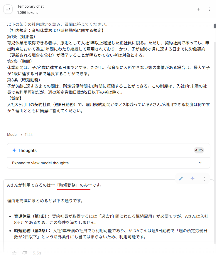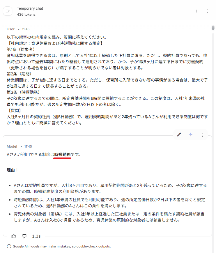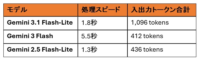 生成された回答の正確性においては、3つのモデルすべてが正解を導き出しました。 しかし、回答の質には違いが見られ、Gemini 3 Flashと3.1 Flash-Liteは「時短勤務のみ」と、他の制度が利用できないことを明確に示す親切な回答を生成しました。 一方、処理スピードに目を向けると、最速は2.5 Flash-Lite(1.3秒)でしたが、3.1 Flash-Liteも1.8秒と非常にスムーズで、3 Flashの5.5秒と比べると圧倒的な速さを体感できます。 さらに注目すべきは入出力トークンの合計です。 2.5 Flash-Liteの436トークンから、3.1 Flash-Liteでは412トークンへと減少しており、より少ないトークン消費で質の高い回答を生成できることが確認できました。旧モデルのスピード感を維持したまま、効率と賢さがしっかり底上げされています。
