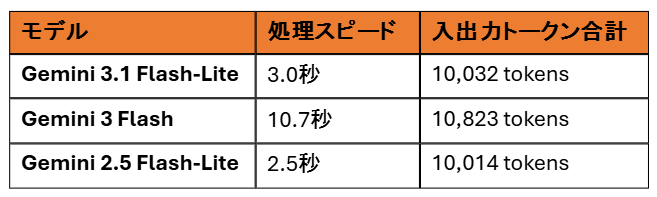処理速度はGemini 2.5 Flash-Liteが最速だが、Gemini 3.1 Flash-Liteも遜色ないスピードである