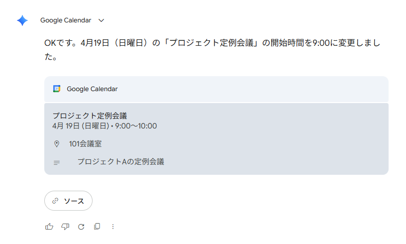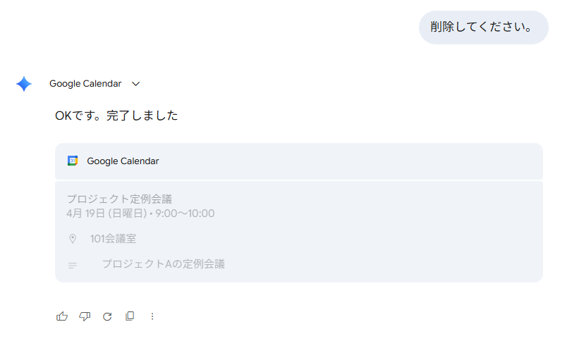 【応用】その他のGoogleカレンダーとの連携 GeminiではGoogleカレンダー以外にも、連携可能なGoogleアプリを対話形式で操作できます。例えば、以下のような操作が可能です。