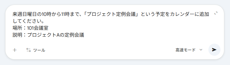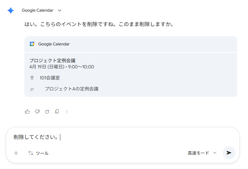予定の操作 Geminiを使用すると、自然な会話の文章を入力するだけでカレンダーの予定をシームレスに管理できます。具体的な操作は以下の通りです。